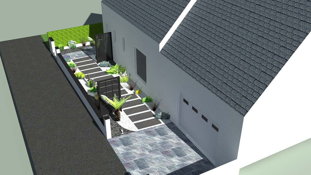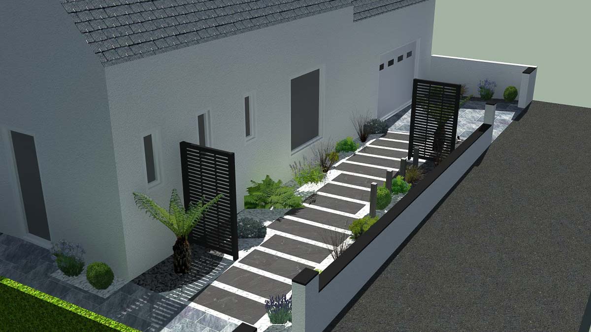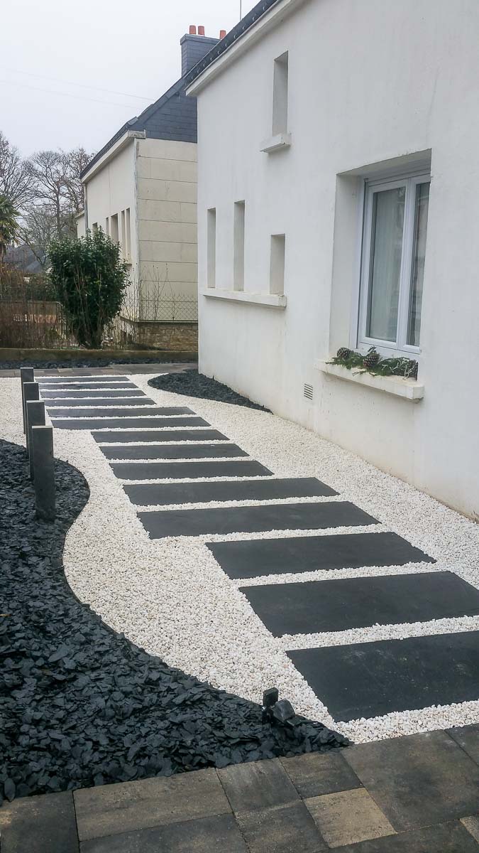 Bouix Paysage a conçu cette allée afin de permettre aux propriétaires de relier l’entrée de leur maison avec celle du garage. Pour donner de la perspective et de la continuité, nous avons choisi de poser des pierres naturelles en ardoise de grand format inspirées des pas japonais. Et pour adoucir la structure, nous avons opté pour une pose de graviers blancs et morceaux d’ardoise.
